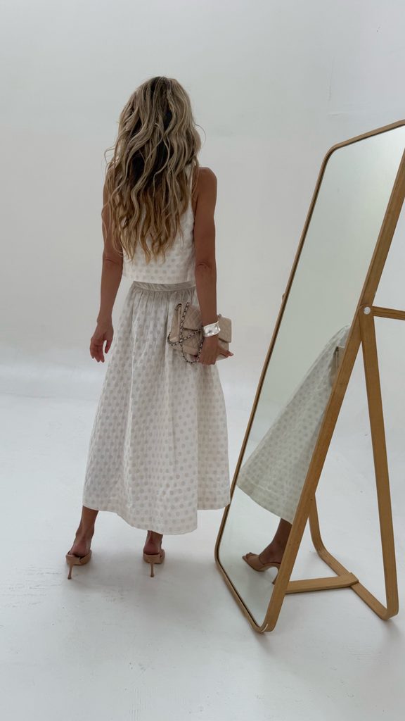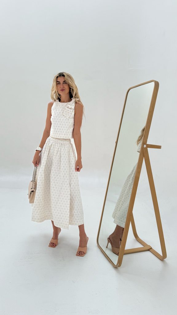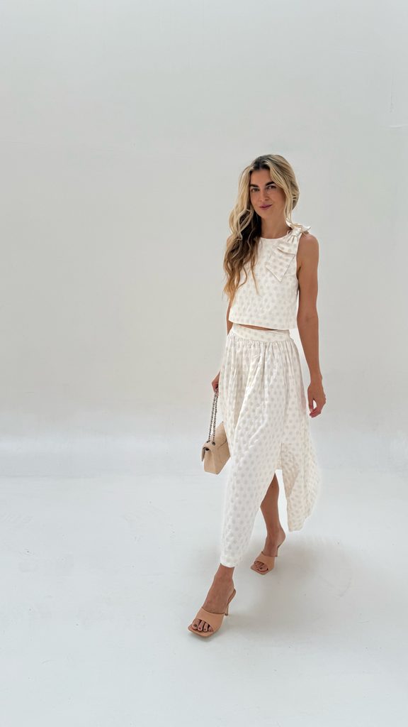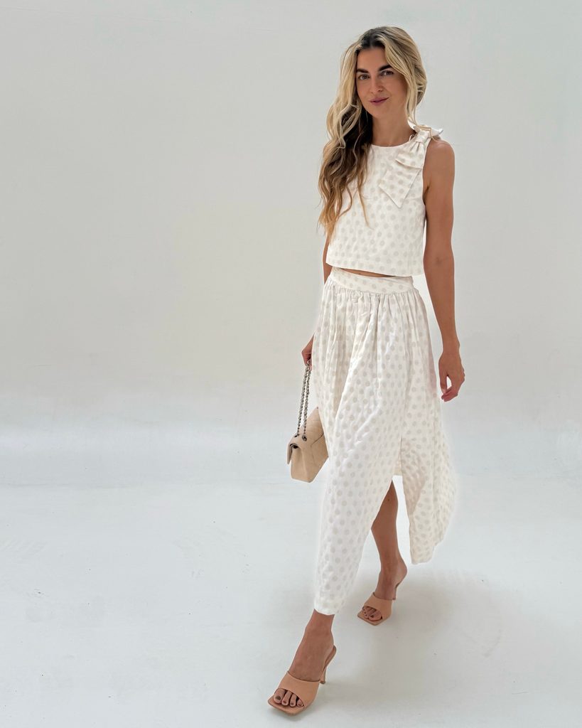 A unique Top and Skirt set with a beautiful cut and dot appliqué. The skirt has a zip fastening and a gorgeous colour, with a cut that flatters every figure. An absolutely perfect set crafted down to the last detail.