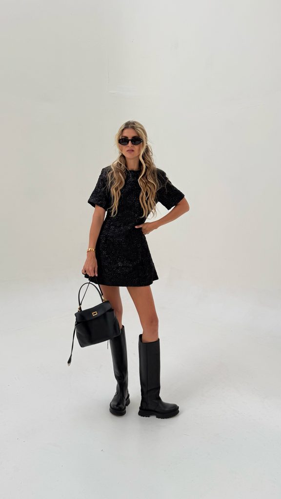Unique dress with a beautiful A-line cut and an appliqué. The dress looks great with biker boots and sandals. For winter, throw on boots.