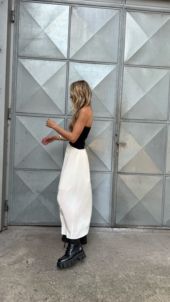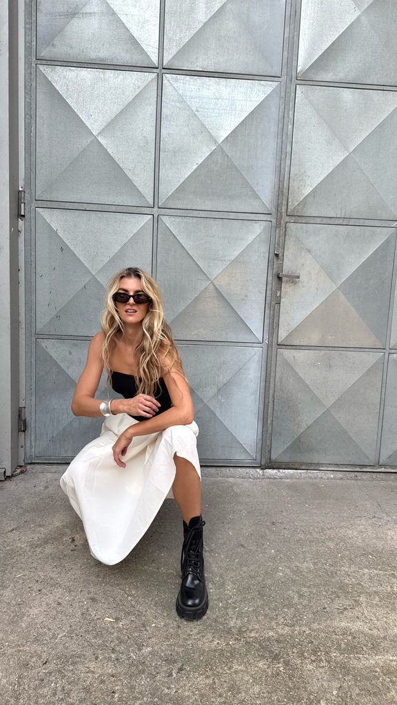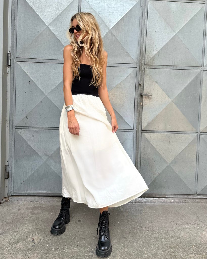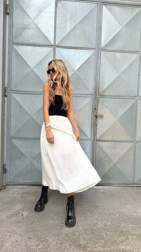 Unique cotton black-and-white maxi dress with a perfect cut. It goes great with boots as well as trainers or sandals.