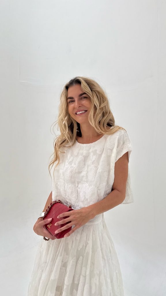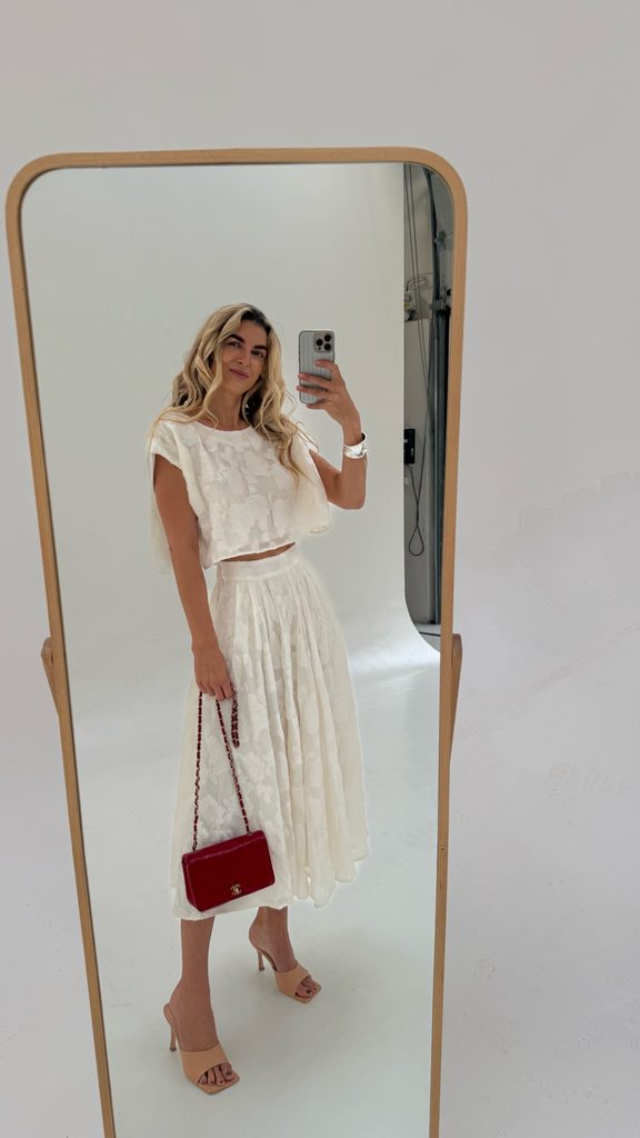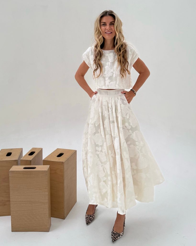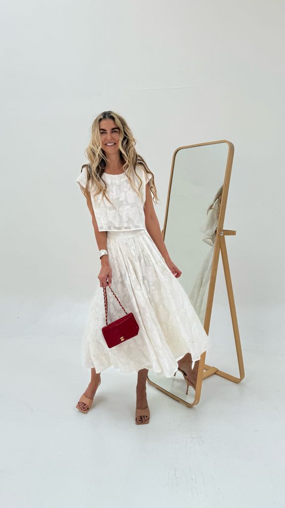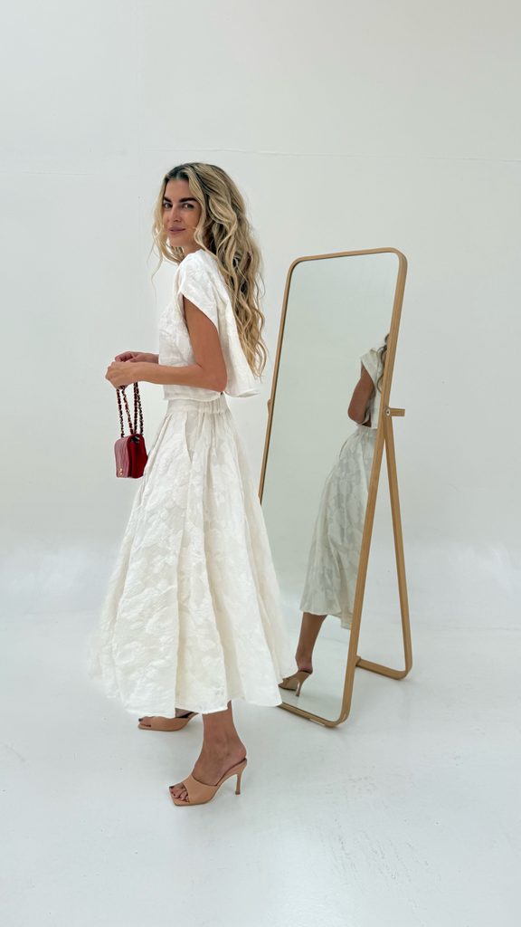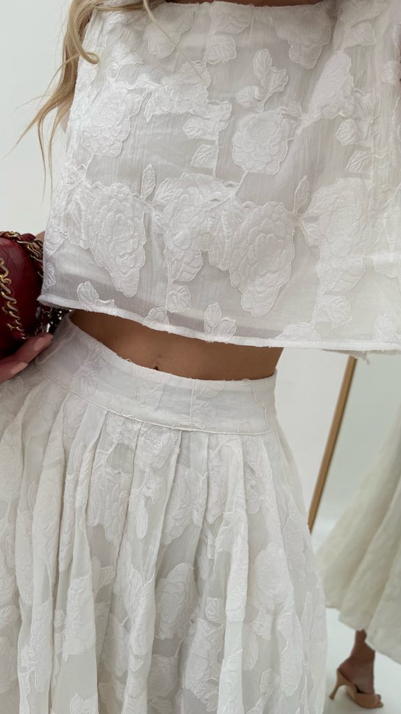 A unique Top & Skirt set with a beautiful cut and floral appliqué. The skirt has a zip fastening and a gorgeous colour, with a cut that flatters every figure. An absolutely perfect set, crafted down to the last detail.