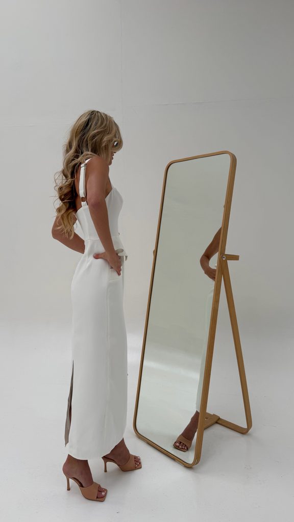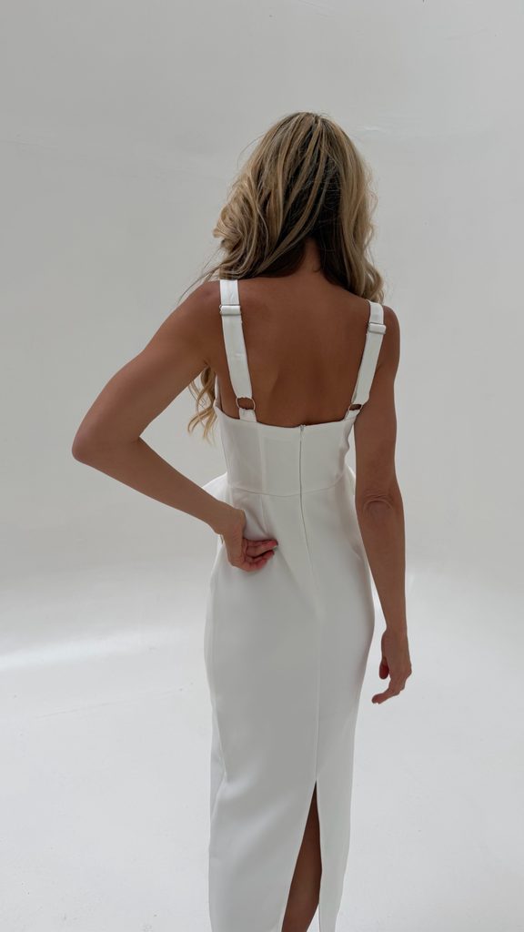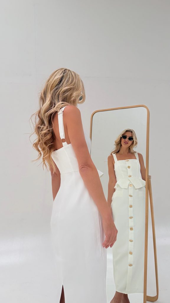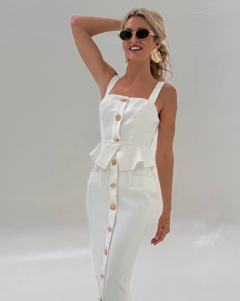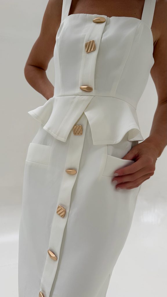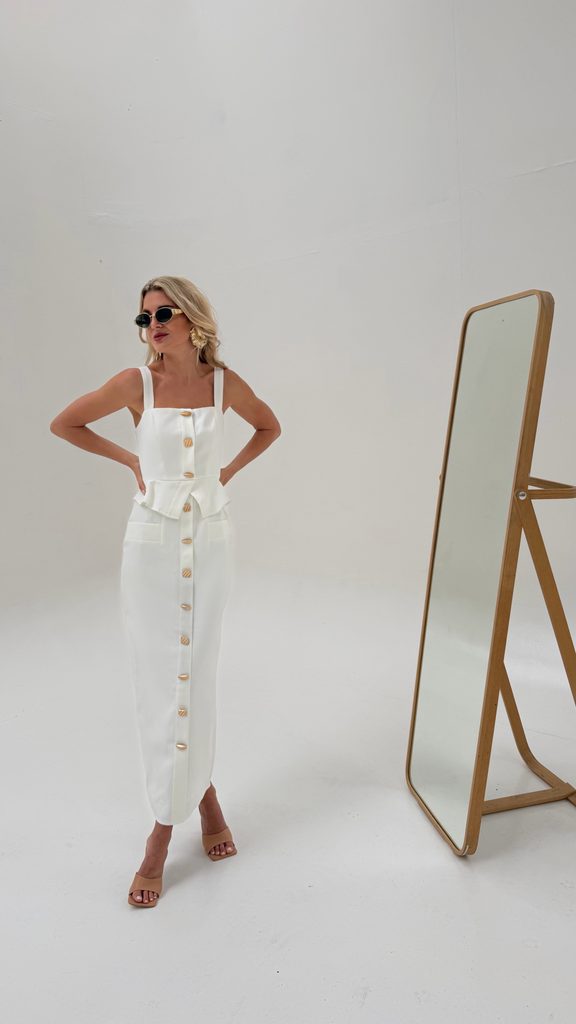 Unique white maxi dress with a perfect cut and gold buttons.