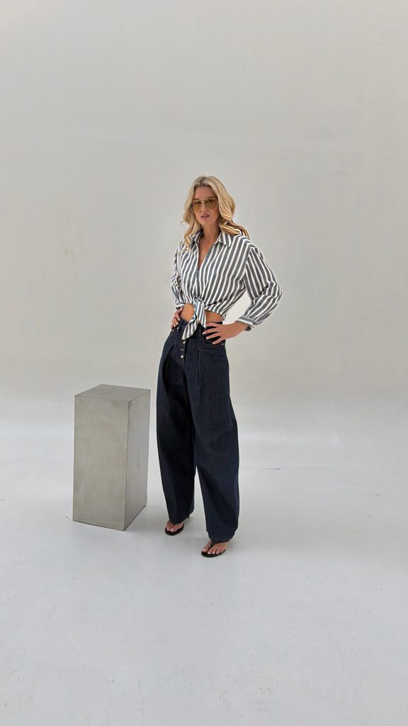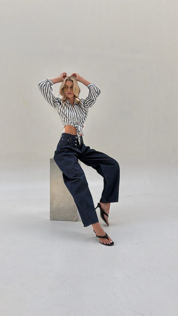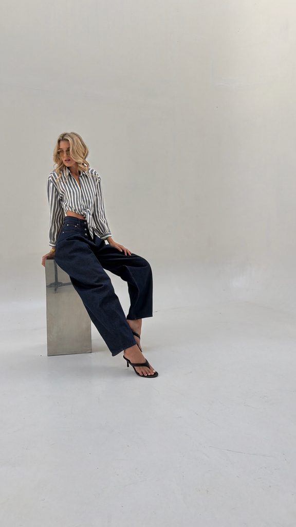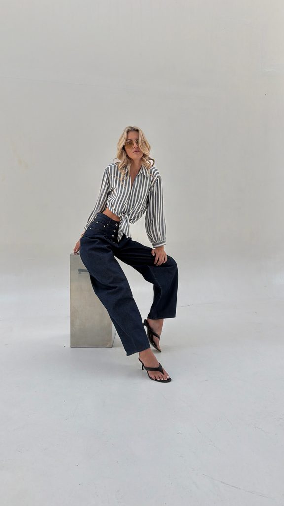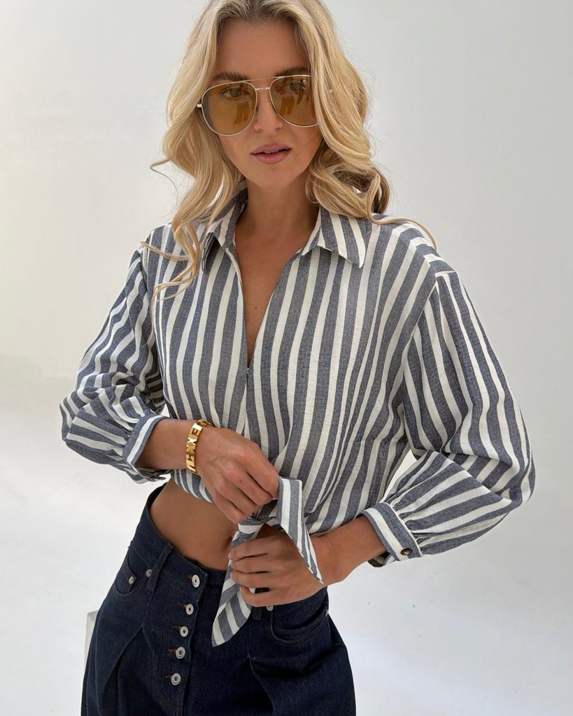 You can style the shirt with wool trousers, a skirt or shorts, or jeans.